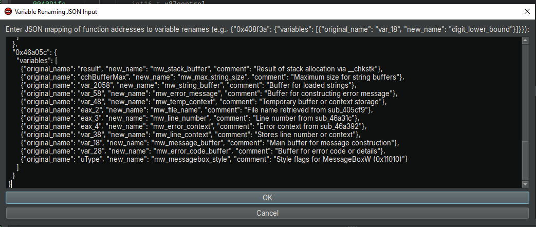 self.label = QLabel("Enter JSON mapping of function addresses to variable renames (e.g., {\"0x408f3a\": {\"variables\": [{\"original_name\": \"var_18\", \"new_name\": \"digit_lower_bound\"}]}}):")