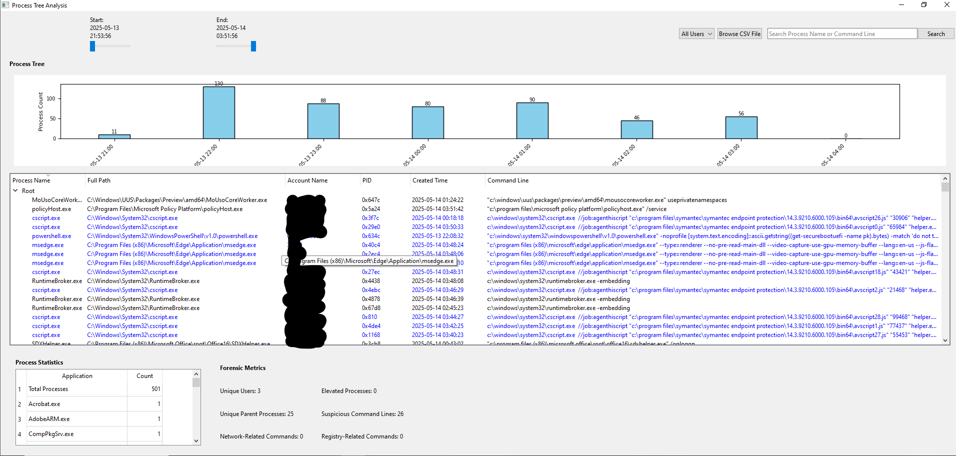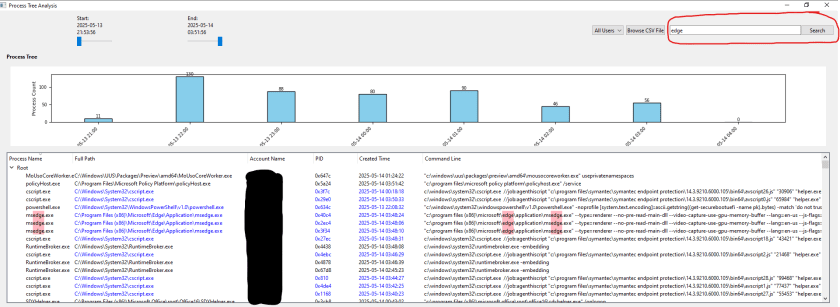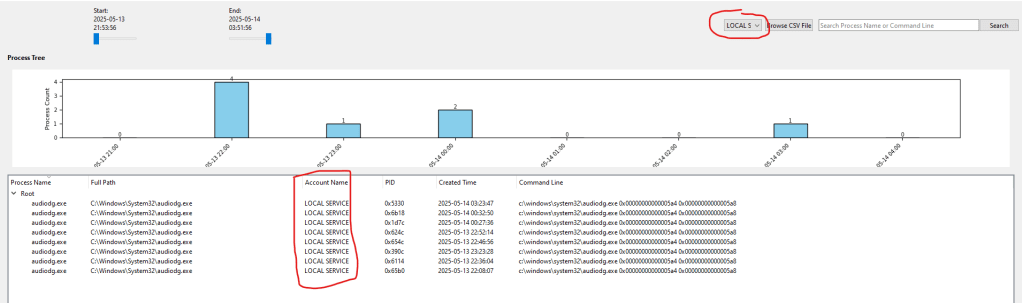 When you’re analyzing processes, focusing on the right timeframe can be crucial, and the time range filtering feature I included makes that easy. The tool has sliders that let you set a specific window of time to analyze. For example, if you’re interested in activity between 03:00 and 04:00 on May 14, 2025, you can adjust the sliders to zoom in on that period.
