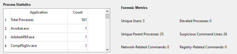 The Process Statistics and Forensic Metrics sections I designed give you a solid overview of process activity. The Process Statistics table lists all the applications and how many times they ran within your filters. For instance, you might see “notepad.exe” ran 3 times, giving you a sense of its activity level.