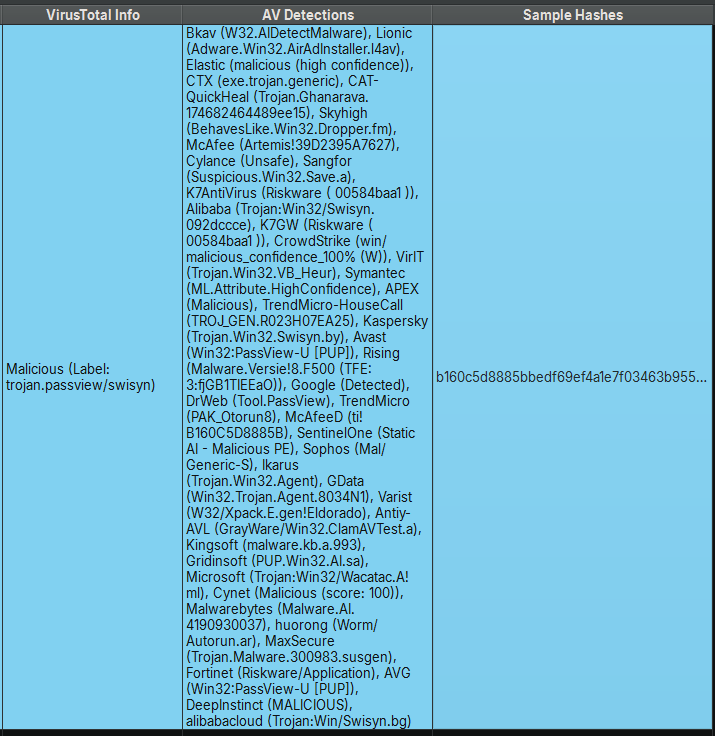 - AV Detections: A comma-separated list of antivirus engine detections for the first malicious file found containing the string (e.g., “Kaspersky (Trojan.Generic), Malwarebytes (Agent.Tesla)”). This provides quick insight into how different vendors classify the threat.