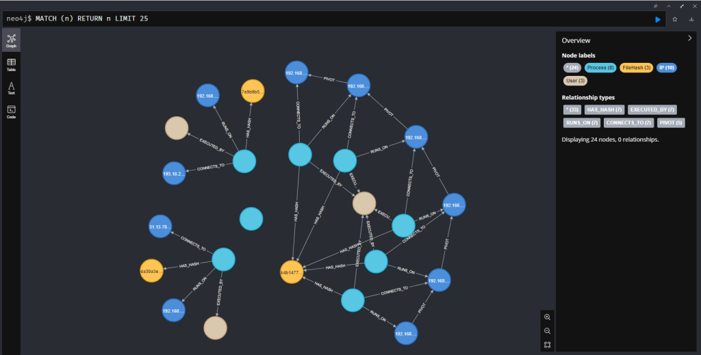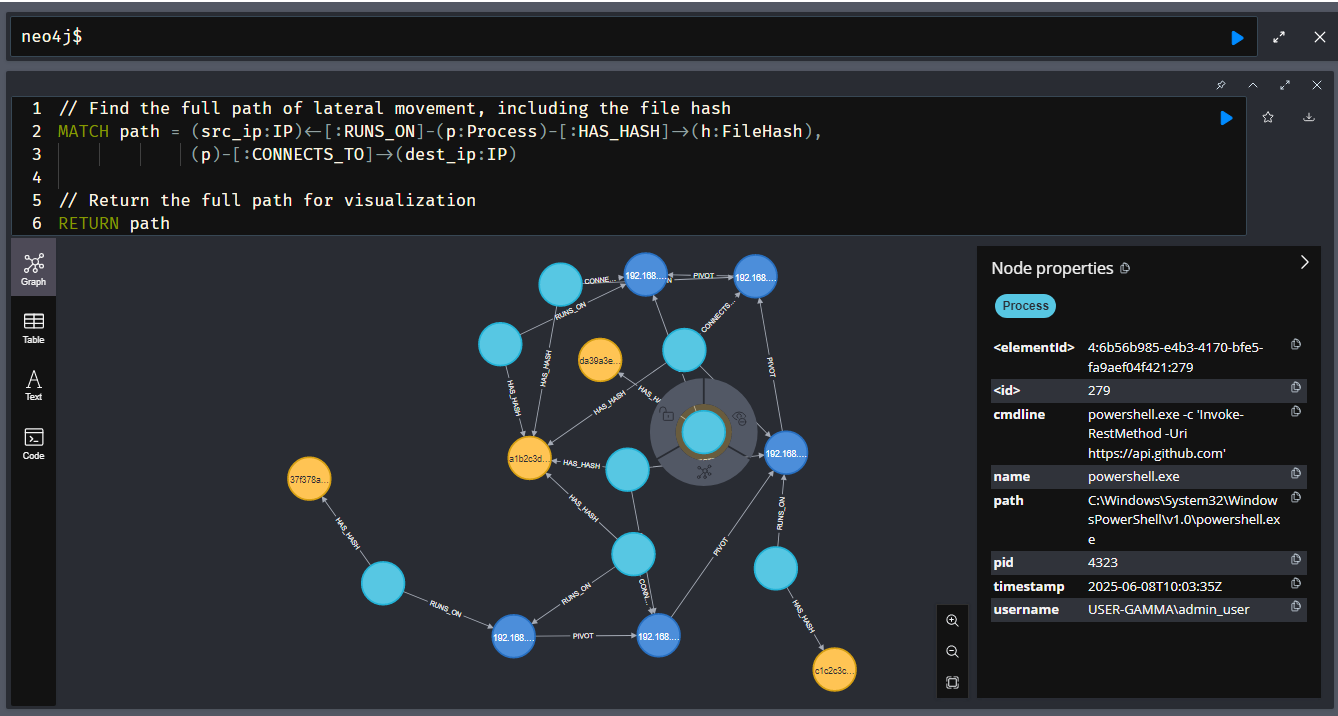 FileHashnode connected to each process, we can instantly see if the same tool is being used everywhere. If we see five different process names (psexec.exe,update.exe,svc.exe…) all pointing to the exact same hash, we’ve caught the attacker red-handed trying to hide their tool by renaming it. This is incredibly difficult to spot in raw logs but stands out immediately in a graph.