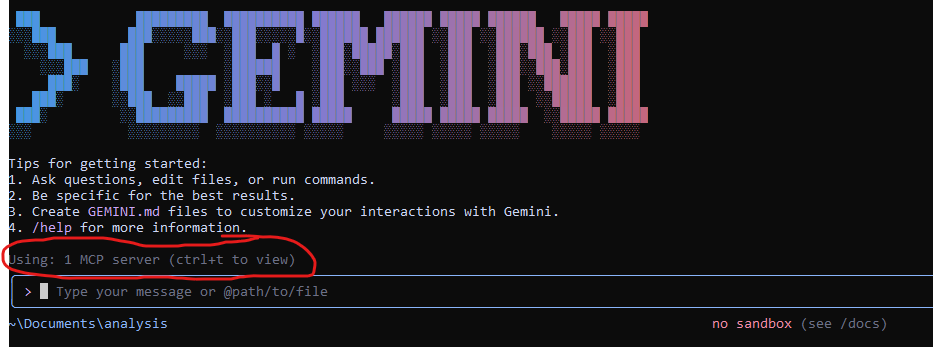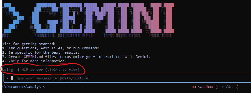 3. Run Gemini CLI, You will find that Gemini CLI is using one MCP server which when you pressed CTRL+T then it will list the API that it can use