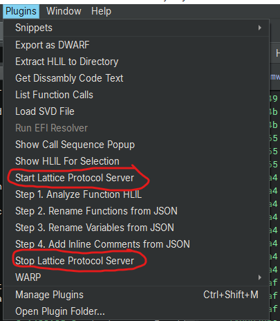 - Start your Lattice Protocol Server by selecting Start Lattice Protcol Server from the Plugin Menu in the Binary Ninja