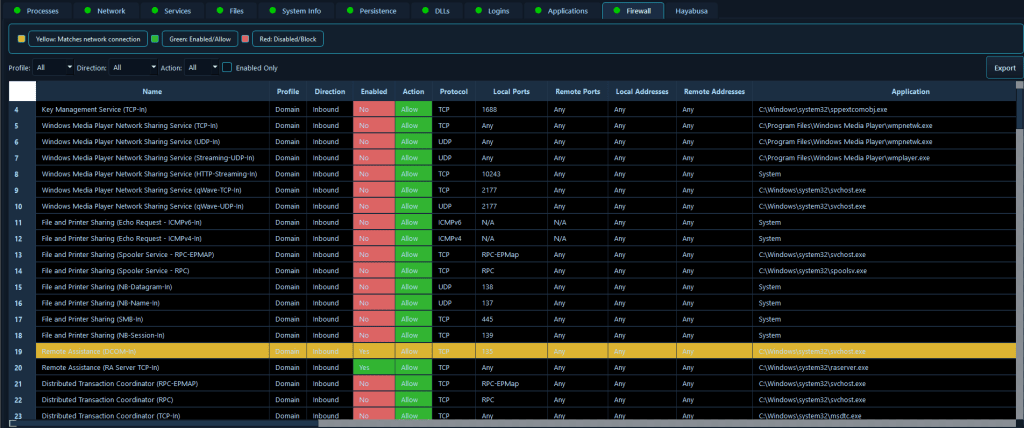 The Firewall Rules Analysis module collects Windows Firewall rules from all profiles, including domain, private, and public profile rules, both inbound and outbound rules, rule actions (Allow or Block), port and protocol information, and correlation with active network connections.
