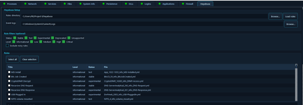 The Hayabusa Event Log Analysis module provides integrated Windows Event Log (EVTX) scanning using Hayabusa-style YAML detection rules. The module can load and compile Hayabusa and Yamato YAML rules, scan single EVTX files or entire directories, provide real-time match detection and reporting, filter rules by status and severity level, offer pause, resume, and stop scan controls, perform multi-threaded scanning for optimal performance, provide match statistics and rule-based grouping, and export scan results for further analysis.