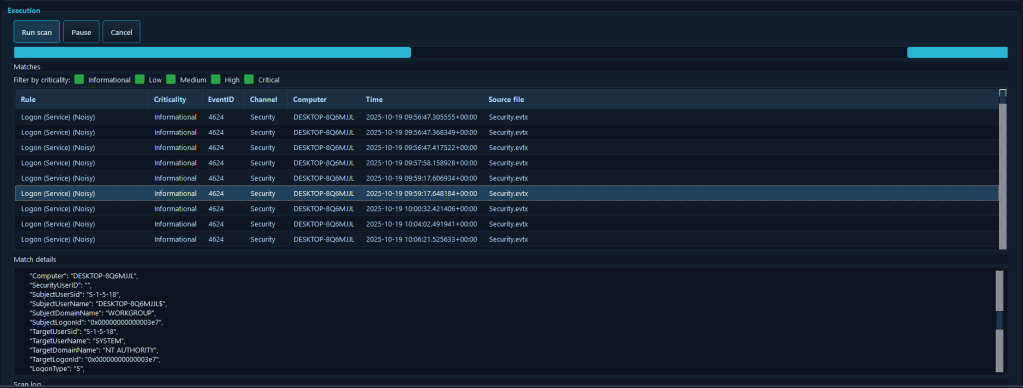 Event log analysis is one of the most time-consuming aspects of incident response, but it’s also one of the most valuable sources of evidence. This module automates the detection of security-relevant events using proven detection rules, enabling incident responders to quickly identify attack patterns, privilege escalation attempts, lateral movement, and other malicious activities without manually reviewing thousands of log entries.