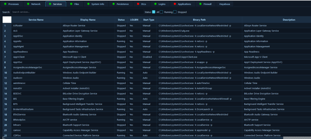 The Windows Services module enumerates services through the Service Control Manager, providing service name and display name, status (running or stopped), start type (automatic, manual, or disabled), binary path, and description information.