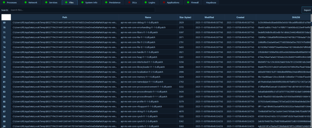 The File System Analysis module scans critical Windows directories, including user and system startup folders, temporary directories, and system directories, while capturing file metadata such as size, timestamps, and attributes.