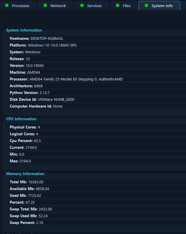 Understanding the system baseline is crucial for incident response, as it helps analysts identify anomalies and provides context for all other findings. This module provides comprehensive system information that enables responders to quickly assess the target system’s configuration, identify potential vulnerabilities based on OS version, and understand system resource constraints that may affect response actions. During an incident involving a compromised workstation, analysts can immediately determine the system’s uptime to identify if a recent reboot occurred (potentially clearing memory-based evidence), review network interfaces to identify all potential communication channels, and assess disk space to determine if log rotation or data deletion may have occurred. This system context is essential for building a complete incident timeline and ensuring all evidence is properly collected.