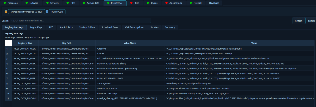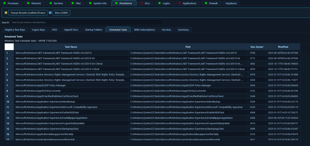 The Persistence Mechanisms Detection module enumerates Windows persistence techniques, including registry Run keys, registry logon keys, registry policies, Image File Execution Options (IFEO) hijacks, AppInit DLLs, COM object hijacks, startup folders, scheduled tasks, Windows services, and WMI event subscriptions.