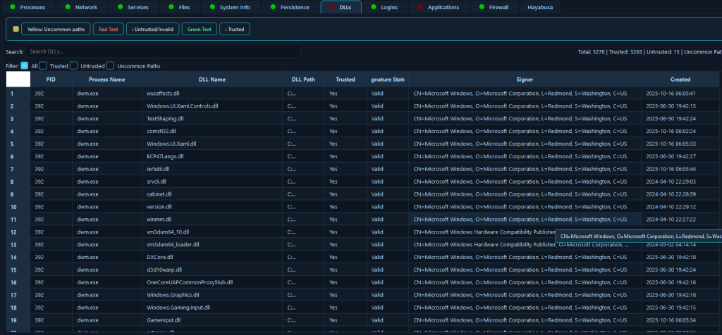 The DLL Analysis module collects loaded DLL information from all running processes, including DLL path and process association, digital signature verification, identification of unsigned or suspicious DLLs, and detection of DLLs loaded from uncommon locations, with incremental real-time updates during collection.