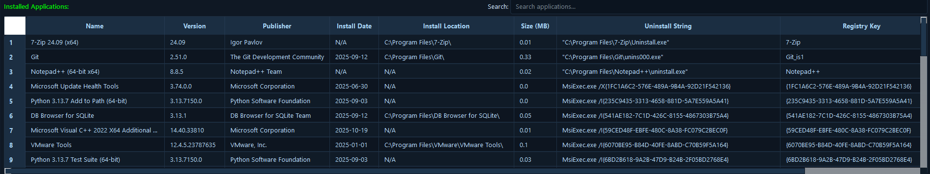 Understanding installed applications is essential for identifying vulnerable software, detecting unauthorized installations, and building a complete picture of the system’s attack surface. This module enables incident responders to quickly identify outdated applications with known vulnerabilities, detect unauthorized software installations that may have been used as attack vectors, and correlate application installations with other attack indicators. During an incident involving a software vulnerability exploit, analysts can immediately review installed applications to identify the vulnerable software version, determine if the application was recently installed (potentially indicating the attack vector), and check for unauthorized applications that may have been installed by attackers. This application inventory is also valuable for post-incident hardening, as responders can identify all software that needs patching or removal to prevent future incidents, and it helps build a baseline of legitimate software that can be used to identify anomalies in future investigations.