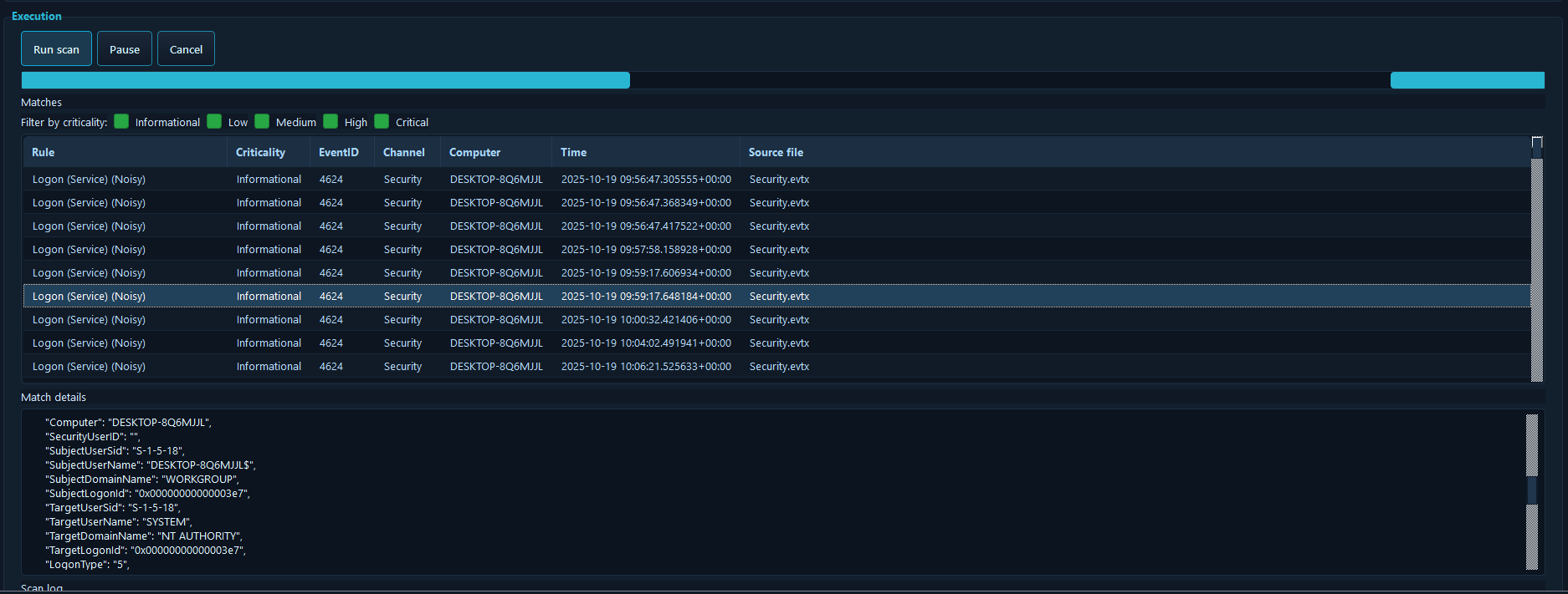 Event log analysis is one of the most time-consuming aspects of incident response, but it’s also one of the most valuable sources of evidence. This module automates the detection of security-relevant events using proven detection rules, enabling incident responders to quickly identify attack patterns, privilege escalation attempts, lateral movement, and other malicious activities without manually reviewing thousands of log entries.